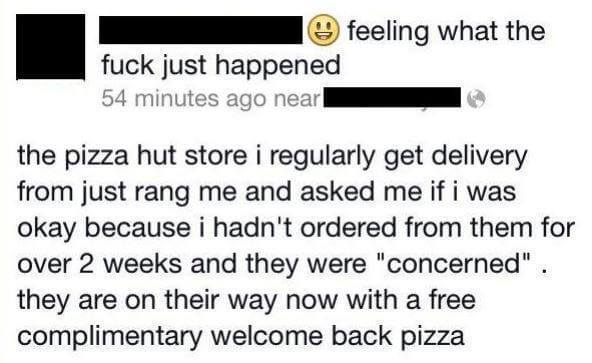 This story speaks for itself. A Pizza Hut customer who ordered on a regular basis had suddenly gone MIA. The Pizza Hut branch was concerned about its loyal client and called him, asking if he was okay, as he had not ordered from them for over two weeks. To his surprise, they also offered him a complimentary “welcome back” pizza. He did not hesitate to share the story on Facebook.